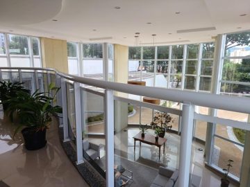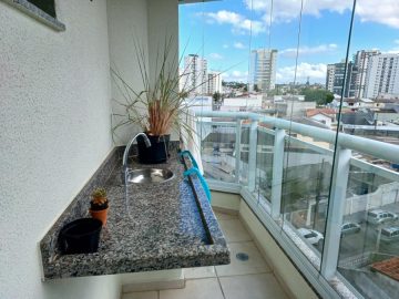- Varanda gourmet com churrasqueira, pia e fechamento em vidro
