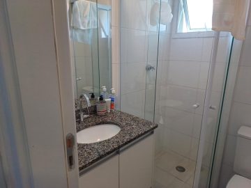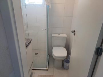 - Banheiro completo com box, chuveiro e armário de pia
